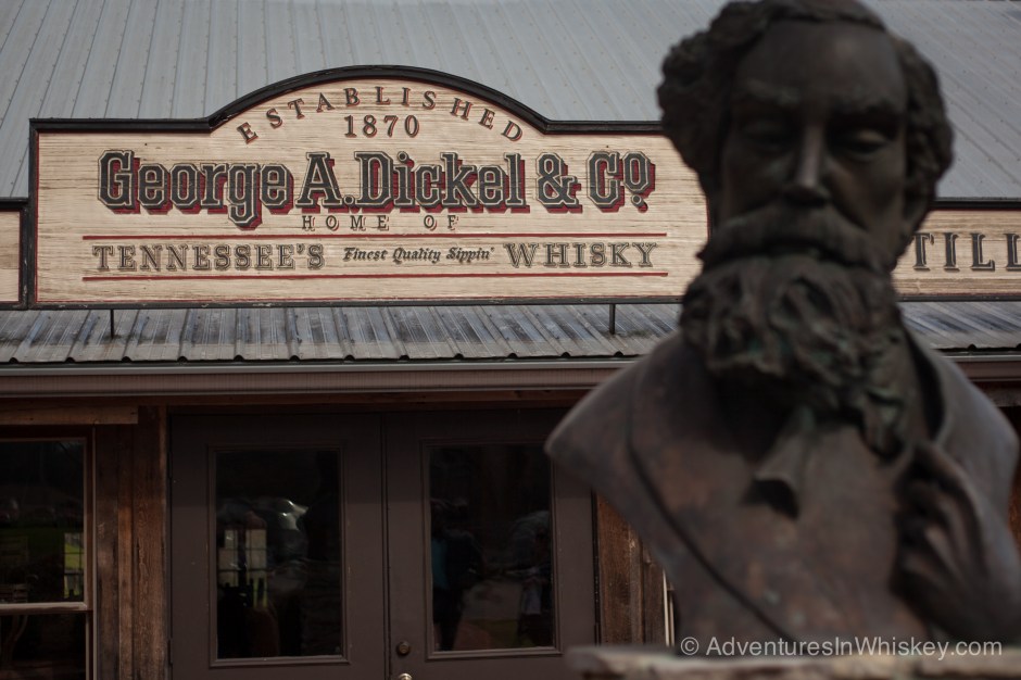 A bust of George Dickel in front of the gift shop at Cascade Hollow.