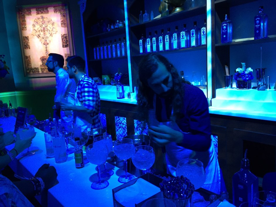 Mixologists crafting gin cocktails at the Bacardi party.