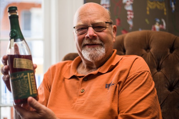 Jim Beam Master Distiller Fred Noe holding a bottle of the excellent Booker’s Rye whiskey.