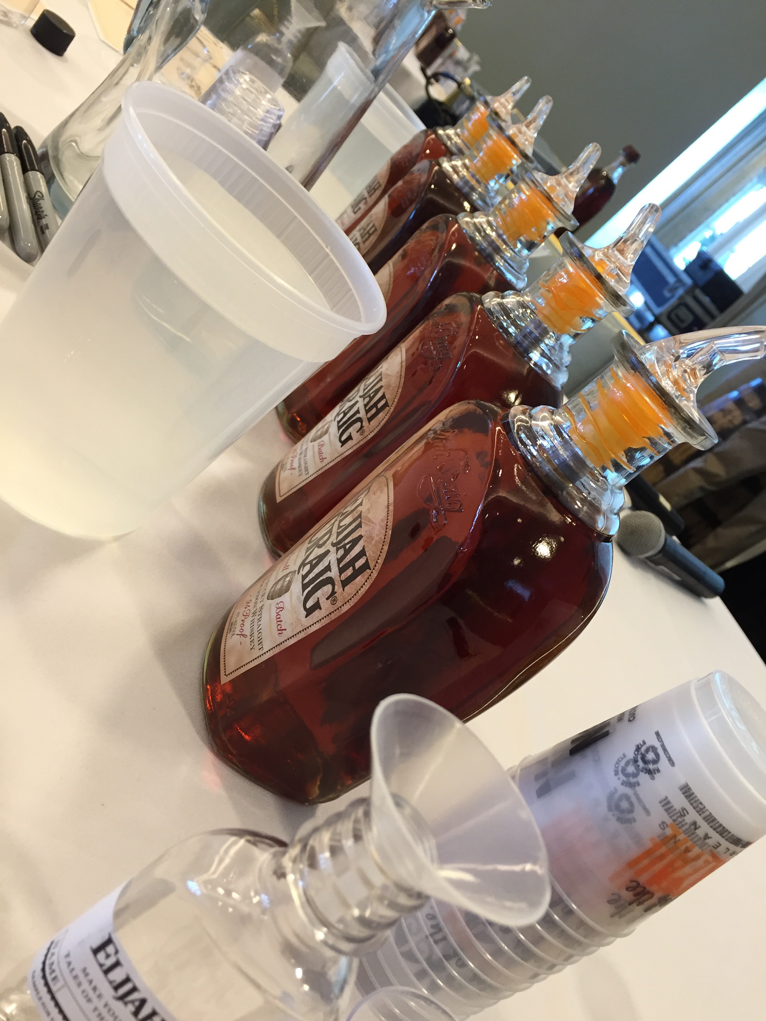 Fast forward to the event. I was to guide Heaven Hill Master Distiller Denny Potter though some topics regarding Elijah Craig, the real star of the show. Recently Heaven Hill removed the 12-year age statement from Elijah Craig and decided to focus on the flavor profile. It’s all in the blend, right? That was the objective of this event.After some history and production tidbits, guests began blending their own batch of Elijah Craig. They had 5 bottles in front of them, marked “A” through “E”, all single barrel picks ranging in age from 8 to 12 years. Attendants had no idea of the age of each bottle. We suggested they pour a little and experience each bourbon first, followed by actually blending their own batch by flavors they liked best. In the meantime, Denny and I walked table-to-table helping folks out and finding out which bourbon(s) they liked best, and he took a couple of questions from the crowd. When everyone was finished blending, we revealed the ages of the bottles. The interesting thing is there was no clear favorite among the different bourbons. People seemed to like them all, from the 8YO to the 12YO. I guess it just goes to show age isn’t everything. At the end of the seminar, the guests were able to take home a 100ml bottle of their blend.